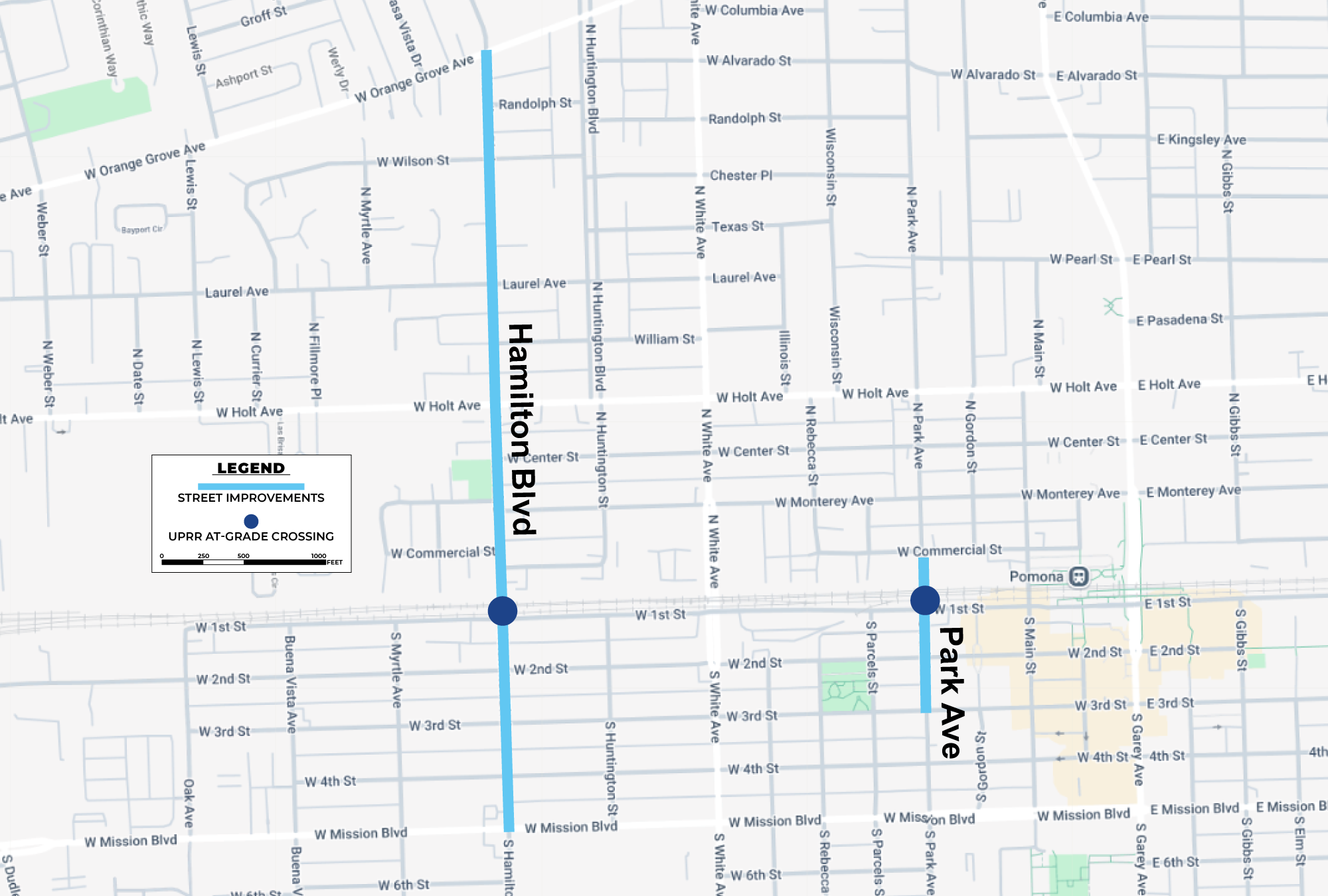 The City of Pomona, a vibrant yet walkable community, is currently divided by a high-volume east-west multi-track freight and passenger railroad. These critical corridors deserve the latest active transportation infrastructure, such as enhanced sidewalks and bike lanes through these two key at-grade crossings at Hamilton Boulevard and Park Avenue.